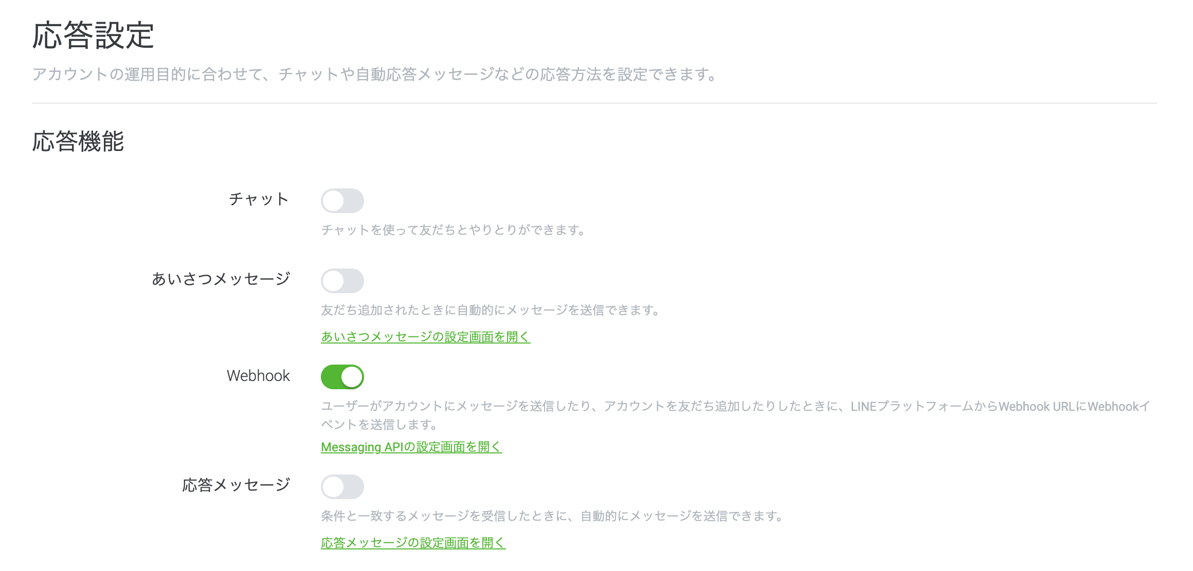 ①LINE公式アカウントの「応答設定」で若干の仕様変更がありました。以下の画像を参考に、設定を進めてください。(以下の動画4:02〜)②LINE Developersの登録において、「Company or owner’s country or region」という国を選択するところは「Japan」を選択してください。